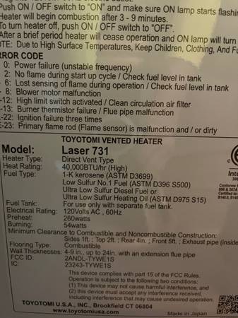 TOYOTOMI Laser731 heater for No.1 low sulfur fuel oil or K1 Kerosene, for home heating. This is the Wi-Fi capable model (if you download Toyotomi’s app for it). 15k to 40k BTU. 87% AFUE rating. Super efficient. Check Toyotomi website for complete specs and description. The unit includes the bottom pan, securing/tip-over prevention brackets, direct-vent wall flue and cap, and owner’s manual. I will include, for FREE, a brand new King Fill Alarm/Gauge for your fuel tank.