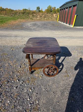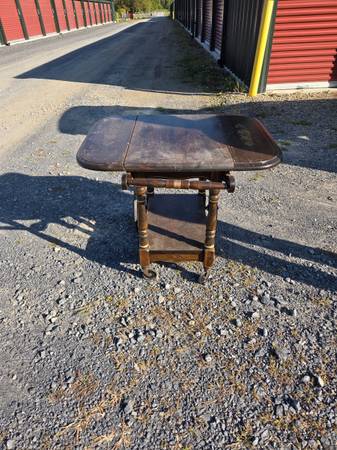 This beautiful vintage tea cart is definitely a collector's item. The leafs fold down.