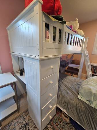 Twin bunk bed set, white color. The bottom bed is not attached to the top section- allowing for many room configurations such as having a loft with an open space below. The left side of the loft has five small drawers and a tabletop/shelf. The right side of the loft has a desk with three small drawers. The latter is removable. The set is four years old and does have minor signs of wear and tear such as a few scratches. The two twin mattresses are included, older but no stains or major wear. The set will need two people to move the pieces, pick up only. Pictures show the bunk bed in its current location and also as advertised on the Wayfair website with approximate specs/dimensions. The set retails about $900 without mattresses, asking $350 with mattresses.
