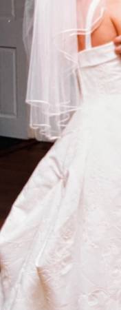 Gorgeous wedding gown - can be worn with straps or without. Has delicate pearls all throughout, as they accent the embroidered flowers