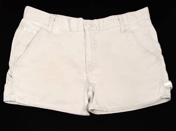 Offered are Vintage Calvin Klein Khaki Carpenter Shorts. Classic 5-pocket styling with leg hammer loop, vertical tool pockets on right leg, spell out tag on rear patch pocket, and zipper fly. Natural wash wear contributes to a soft broken-in authentic vintage look.