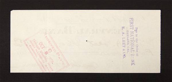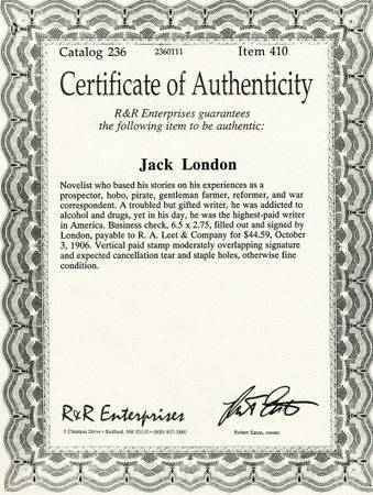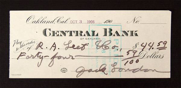 Offered is one Original Jack London Hand Signed Cancelled Check. Completely filled out in his own hand, and signed, "Jack London" in black ink. Drawn on an account at the Central Bank of Oakland in Oakland, Cal., dated October 3, 1906, and payable to R. A. Leet & Co. in the amount of $44.59.
