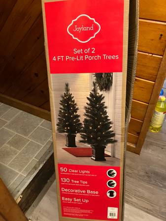 Two Christmas trees new in box. 50 clear lights each. Decorative bases. 4 feet tall.