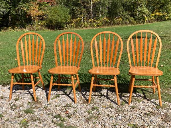 Dining table with leaf for sale. Includes four solid captains chairs. Chairs are very sturdy. No wobble to them. The table top has some white stains from using the wrong cleaner. Refinish the top or...